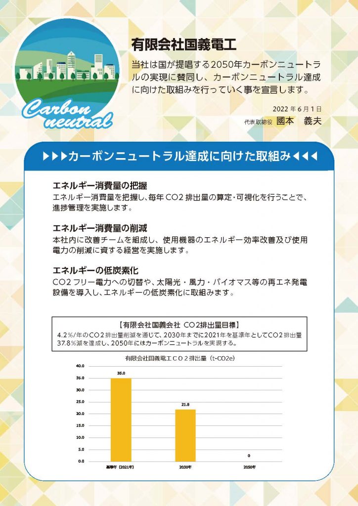 当社は国が提唱する2050年カーボンニュートラルの実現に賛同し、カーボンニュートラル達成に向けた取組みを行っていく事を宣言します。