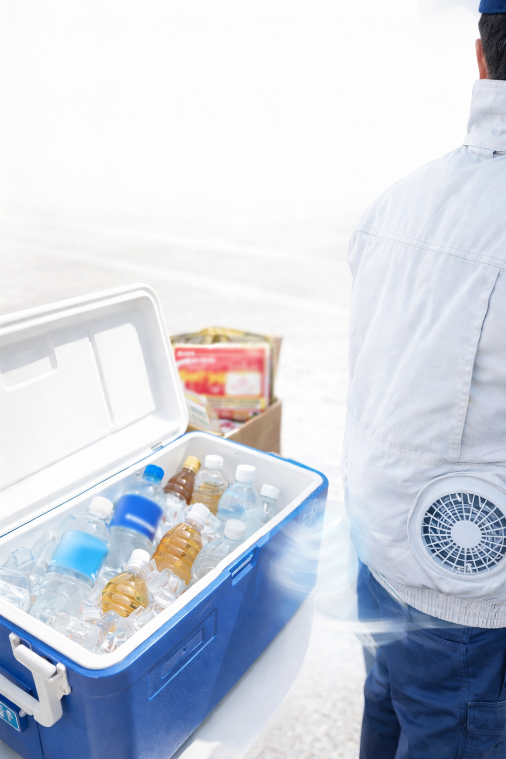 暑い時期はポカリや麦茶、水、塩ゼリーなどが用意され、クーラーボックス用の氷も持ち出せます。さらに、空調服の支給もあり、現場で働く人の暑さ対策がしっかり考えられています。